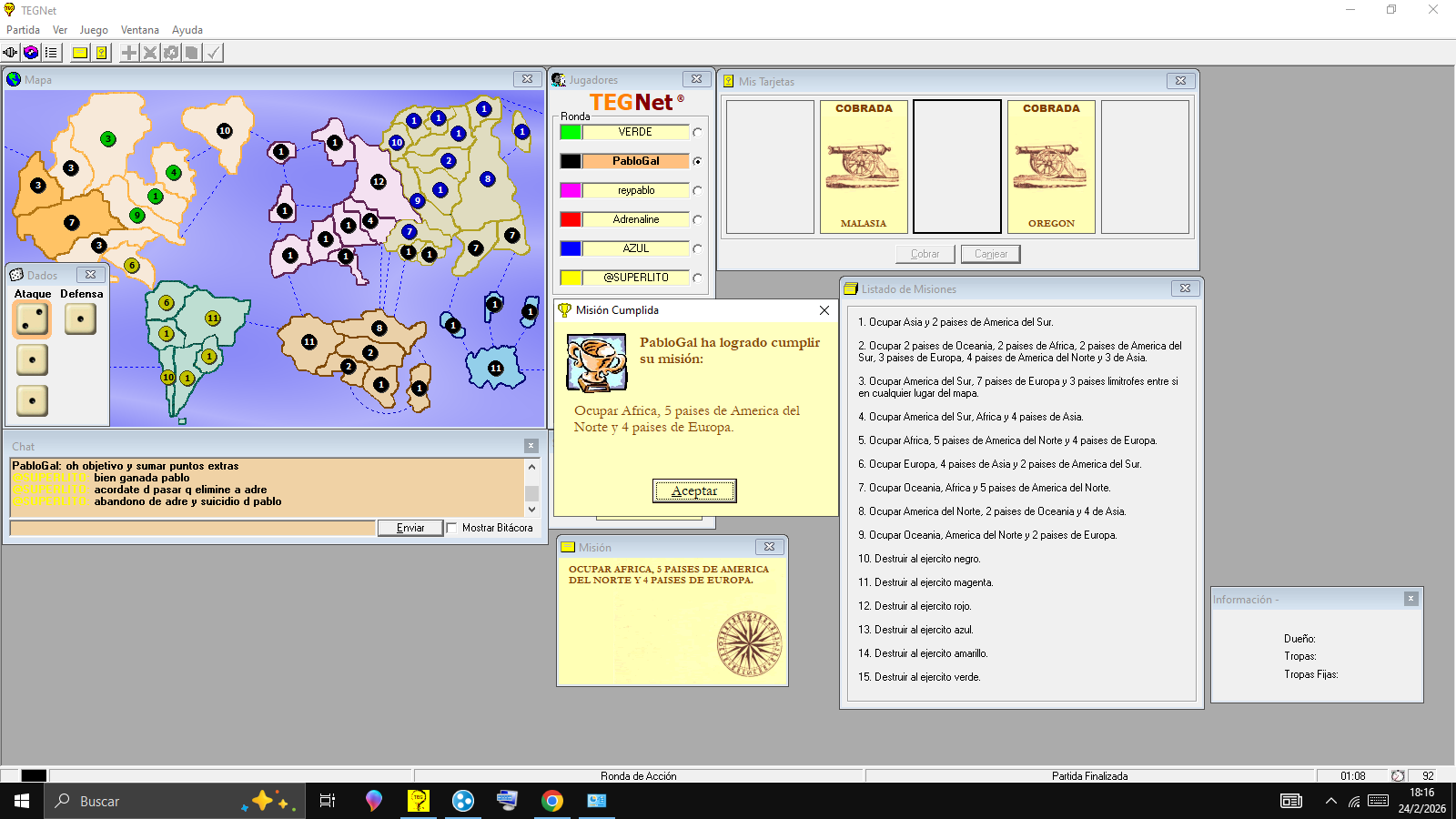 PabloGal elimino a Reypablo quiero aclarar que en una parte de la partida se suicido atacandome sahra desde etiopia con 13 fichs 1 solo paius y el jugador adrenaline abandono en la ultima ronda con 1 solo pais fue eliminado su bot por superlito