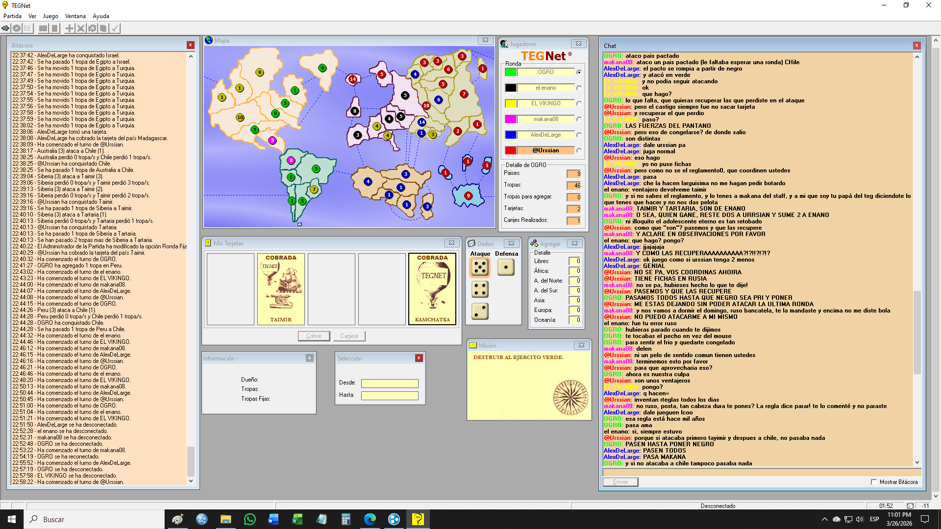 Se dio una situación en la anteúltima ronda. Yo Urssian ataqué Chile que estaba pactado desde Australia (el pacto se había roto pero faltaba un ronda para poder atacar) Dejé de atacar Chile al notar el error, pero seguí atacando y conquisté Taymir y Tartaria que eran de Enano (con los que no había pacto). Yo desconocía esa nueva regla de quedarse “congelado” y no hacer ningún movimiento luego de violar un pacto. Creí que como siempre se podía seguir atacando en otro lado y reagrupar (sin sacar tarjeta). Pero bueno, al entender que el reglamento cambió, propuse arreglar con fija y que enano recupere sus países, pero ya era medio tarde y no hubo disposición a hacerlo. Paso la partida con las posiciones al momento de terminar (o suspender, porque no se jugó la última ronda) descontándome los 2 países conquistados de forma anti reglamentaria, y contándoselos al enano, pero obviamente dejando a criterio del staff resolver si corresponde algo distinto.